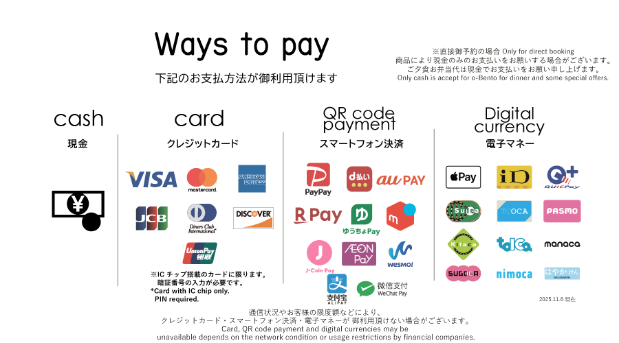 Only cash is accepted for "Obento for dinner". 麻烦您登记入住时,请先支付住宿费用。(目前本馆不收取预订时的订金)